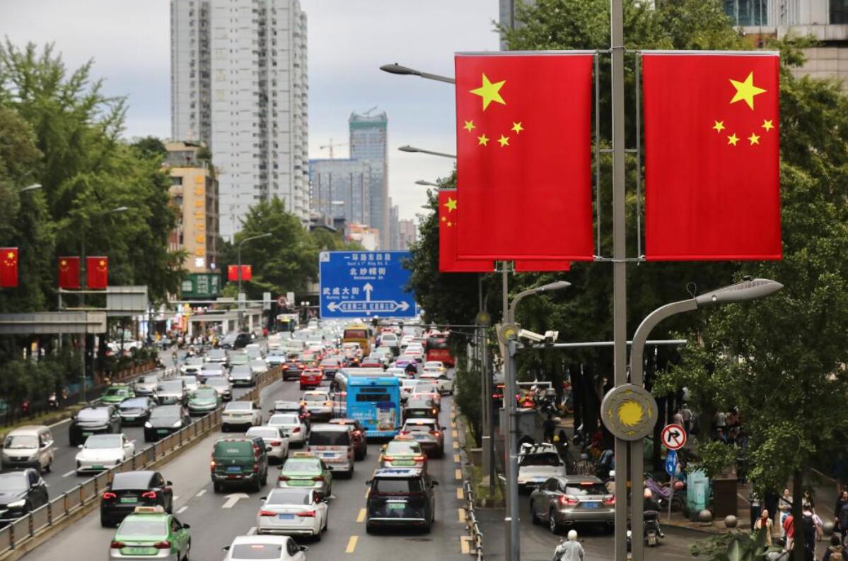 成都街头悬挂五星红旗迎国庆