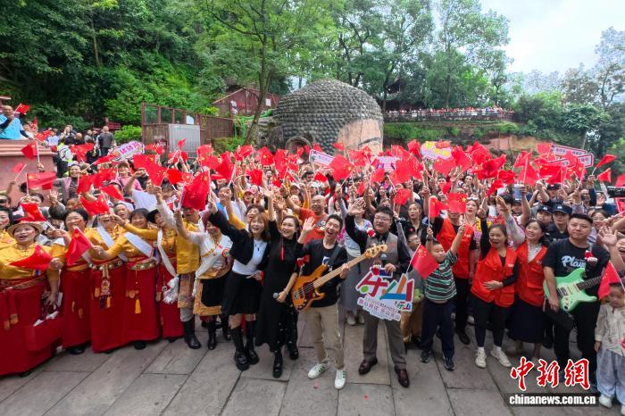 四川乐山大佛景区数千名游客共庆祖国华诞
